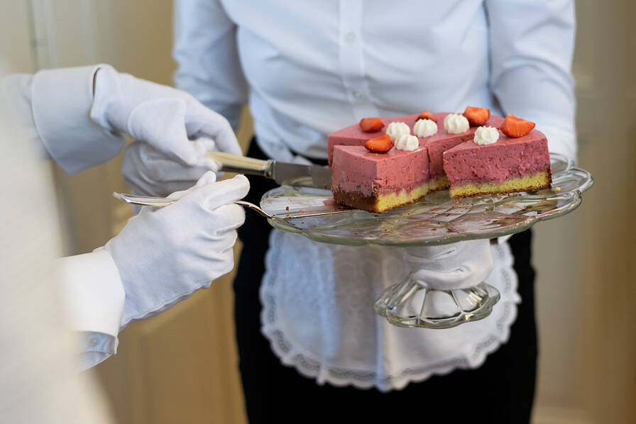 图为甜点服务礼仪训练。