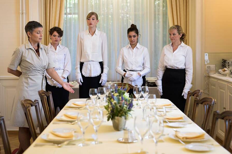 大部分学生家里雇请佣人,自己无需劳动。不过学校要求所有学生轮流扮演侍者,以便了解家务流程,更好地管理家中佣人。麦卡勒姆轻声提醒她们,拿起香槟杯要捏住靠底托的地方,从客人左方递上梨和罗克福尔奶酪挞。