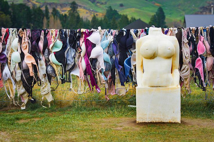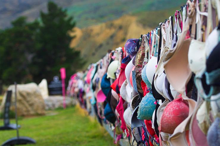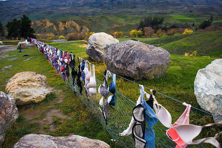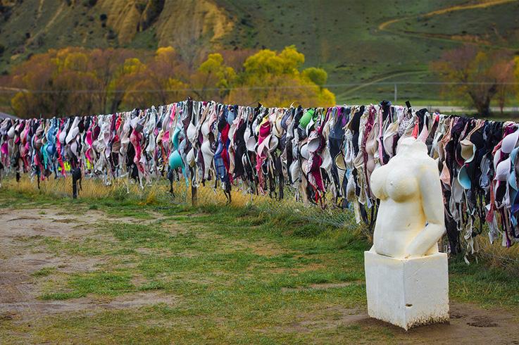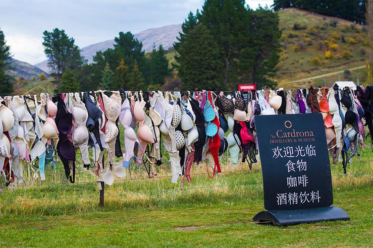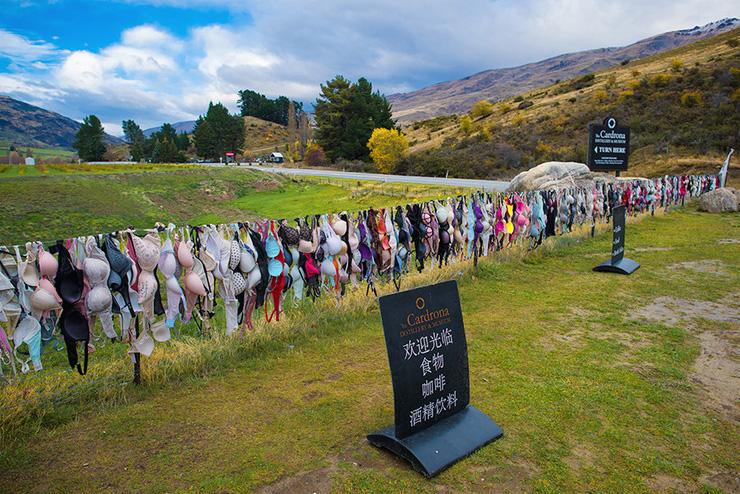 那天一早,我们自驾从皇后镇自驾出发,目的地是瓦纳卡和哈威亚姐妹湖。当我驱车途经卡德罗纳山谷时,远处出现了一溜五彩“经幡”,我正纳闷新西兰怎么会有经幡时,车已来到“经幡”前。眼前的场景让我目瞪口呆,这里怎么挂着这么多各色各样的女性用品——胸罩?