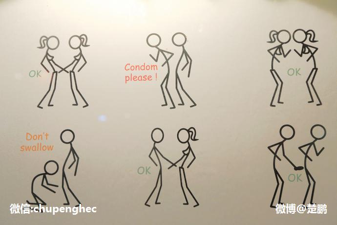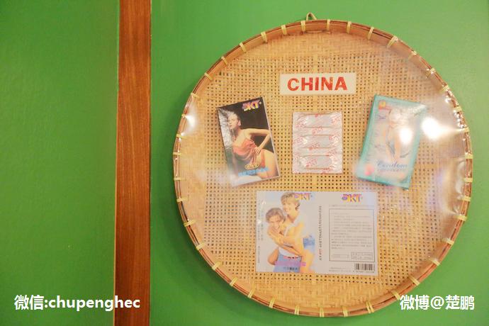 餐厅墙壁上都是全球具有代表性的安全套产品的展览,这是中国的。