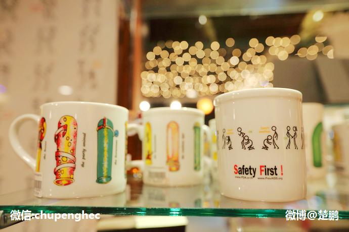 餐厅还专门开了间纪念品商店,有各种以安全套为主题的工艺品,包括设计风格大胆的明信片、杯子、钟表和领带等。