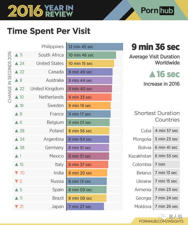 用户平均持续时间9分36秒,平均时间最长的是菲律宾:12分45秒。
