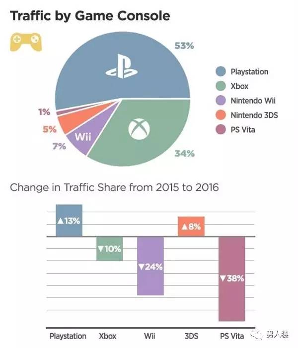 游戏机玩家的DIY情况,索尼大法好:PlayStation主机和PS Vita掌机加起来占据了54%的份额,其中PlayStation主机独占53%。排名第二的则是Xbox用户,占比34%。任天堂玩家单纯得多,Wii和3DS总共占到了12%。